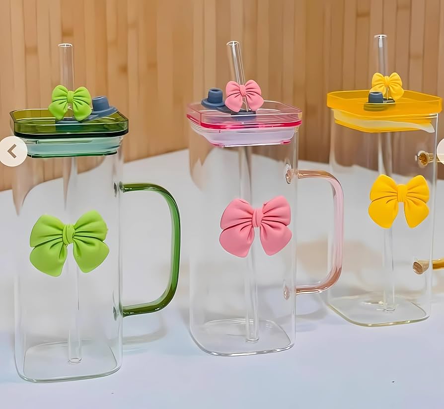 Cute bow square glass cups with lid and straw